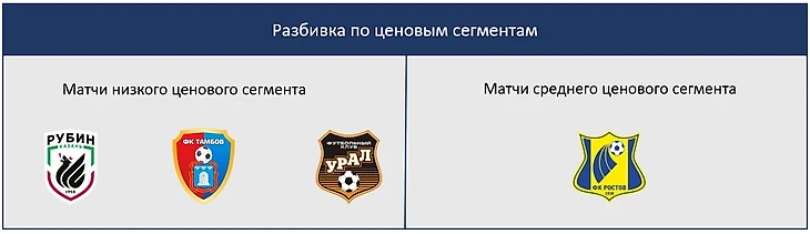Билеты разбиты на 2 категории. Категория №1: Урал, Тамбов, Рубин, (эту категорию я дальше буду называть низким ценовым сегментом) и категория № 2: Ростов (ее буду называть средним ценовым сегментом).