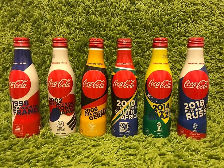 Как вы уже догадались, я очень ждал ЧМ 2018 в России. Однако наши не были оригинальными. Кола в России изменила лишь немного этикетку классической бутылки. Ниже вы можете увидеть, что классика/новый год и ЧМ 2018 (справа) выполнены в одном стиле.