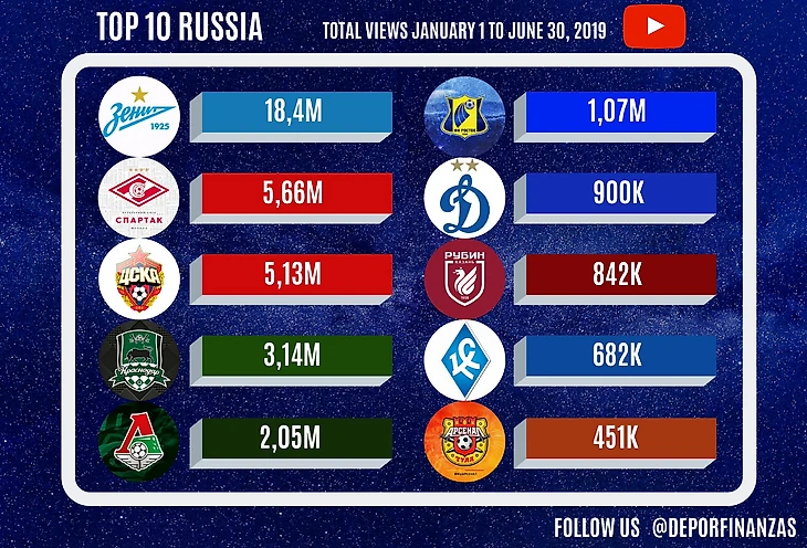 Агентство Depor&Finanzas провело мониторинг эффективности Youtube-каналов клубов российской Премьер-Лиги в период с января по июль 2019 года.