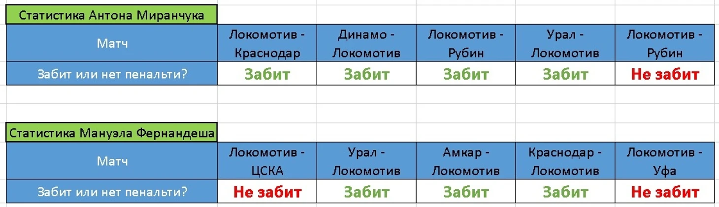 Они могут бить пенальти по очереди, но суть в том, что через 4,46 матча, по среднему значению РПЛ, кто то из них его не забьет.Я привел статистику всех пенальти Антона Миранчука и Фернандеша за Локомотив и по ней видно, что Антон против 4 пенальти, не смог забить свой 5 удар с точки.
