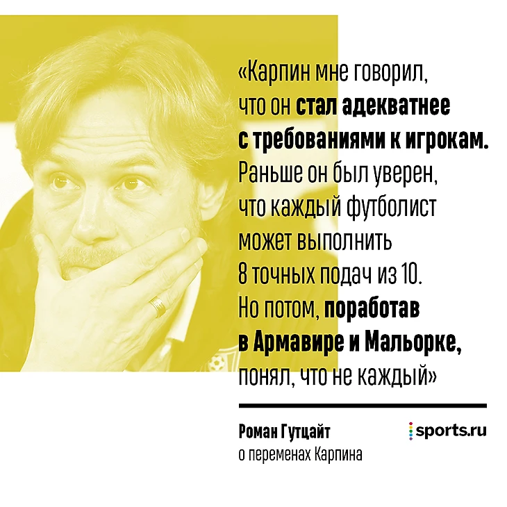 – Ну мы так вопрос не ставили. Ты вот встречаешься с однокурсником, но не спрашиваешь же его: «Старик, а стал ли ты за 10 лет сильнее?». Лично мне очевидно, что за эти десять лет Валера как тренер стал сильнее. Его многому научила поездка в «Торпедо» Армавир. Там он убедился, что тренер должен ставить не тот футбол, в который сам играл, не тот, который любит, а отталкиваться от уровня футболистов. Карпин мне говорил, что он стал адекватнее с требованиями к игрокам. Раньше он был уверен, что каждый футболист может выполнить 8 точных подач из 10. Но потом, поработав в Армавире и Мальорке, понял, что не каждый. И не нужно давить на человека, если он не может сделать то, что ему не дано.