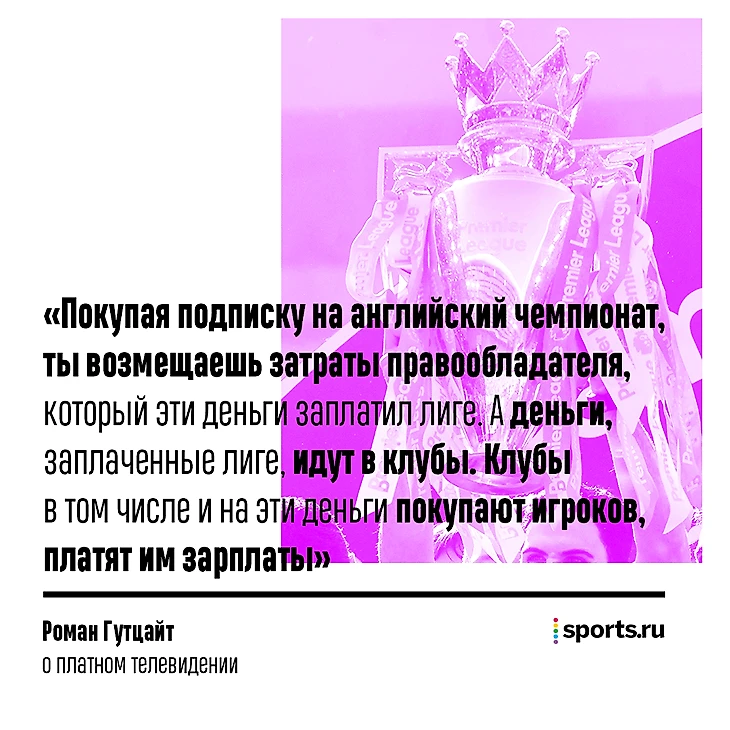 – Я прочитал все комментарии под этой новостью. Меня расстроило, что только один человек понял, почему я вспомнил книгу Уолтера Айзексона о Стиве Джобсе . В чем преимущество iTunes? Авторы песен стали легально и понятным образом получать доход от своих песен. Вот, например, понравился тебе трек Рианны. Ты послушал, получил удовольствие и хочешь, чтобы у Рианны все было хорошо, чтобы она записывала новые песни, чтобы у нее было качественное оборудование. И, покупая ее треки, ты помогаешь Рианне. Покупая подписку на английский чемпионат, на российский, на какой угодно, ты возмещаешь затраты правообладателя, который эти деньги заплатил лиге. А деньги, заплаченные лиге, идут в клубы. Клубы в том числе и на эти деньги покупают игроков, платят им зарплаты – то есть развлекают тебя.