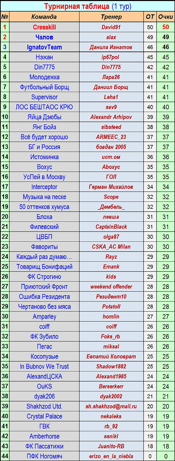 ЛИДЕР Чемпионата ФФ - команда "Cresskill" (тренер - David91) - 50 очков!