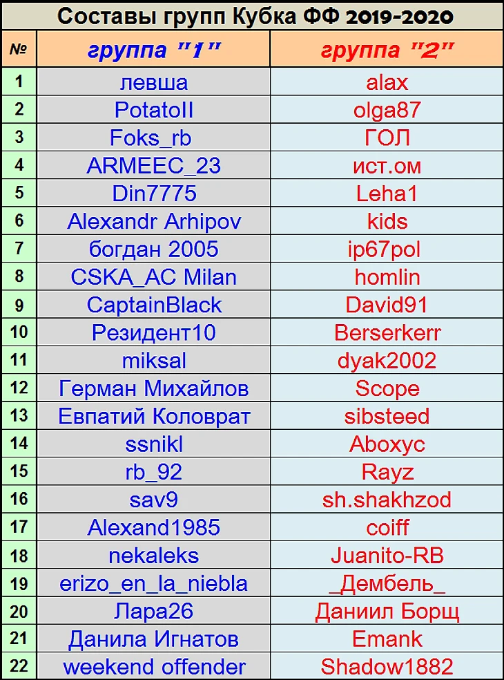 Групповой этап - пройдет со 2 тура тура РПЛ по 22 тур РПЛ. Узнавать своего соперника по туру, следить в режиме онлайн за игрой и быть в курсе результатов и положения в турнирной таблицы своей группы вы можете, уже привычно, на замечательном Н2Н сайте Князева... наш турнир здесь - Кубок Лиги РА