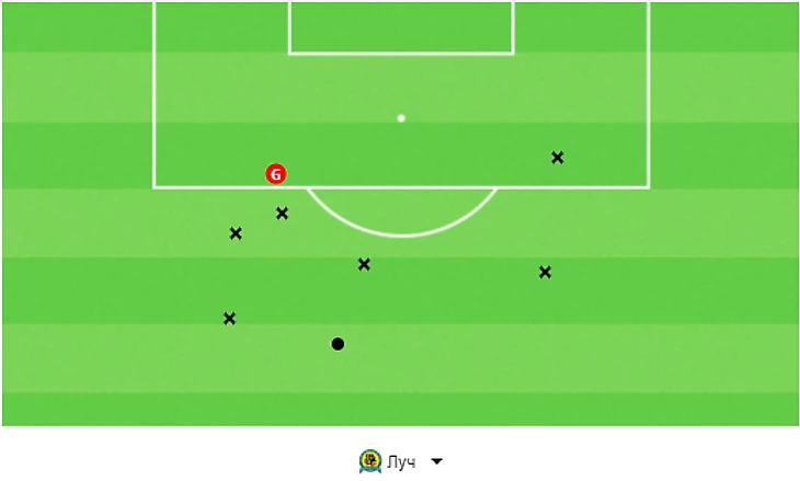 По ударам мы наблюдаем полное равенство (8 - 8), но у "Луча" хромает точность (3 против 6). Однако стоит заметить, что хозяева чаще били из-за пределов штрафной. Это подтверждает схема ударов: