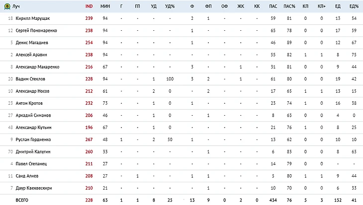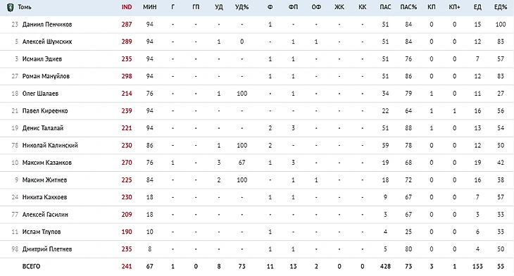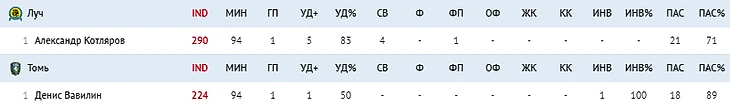 Теперь перейдет от футболистов к самим командам в целом. "Луч" имеет небольшой перевес во владении мячом - 52% (26 мин 11 сек) против 48% (24 мин 36 сек). Угловые 3 - 3, фолы 13 - 11 (но у игроков хозяев 2 желтые карточки), офсайды 0 - 2. Точность передач чуть лучше у "Томи" - 80% против 79%. Также гости чаще выигрывали в единоборствах (57%).