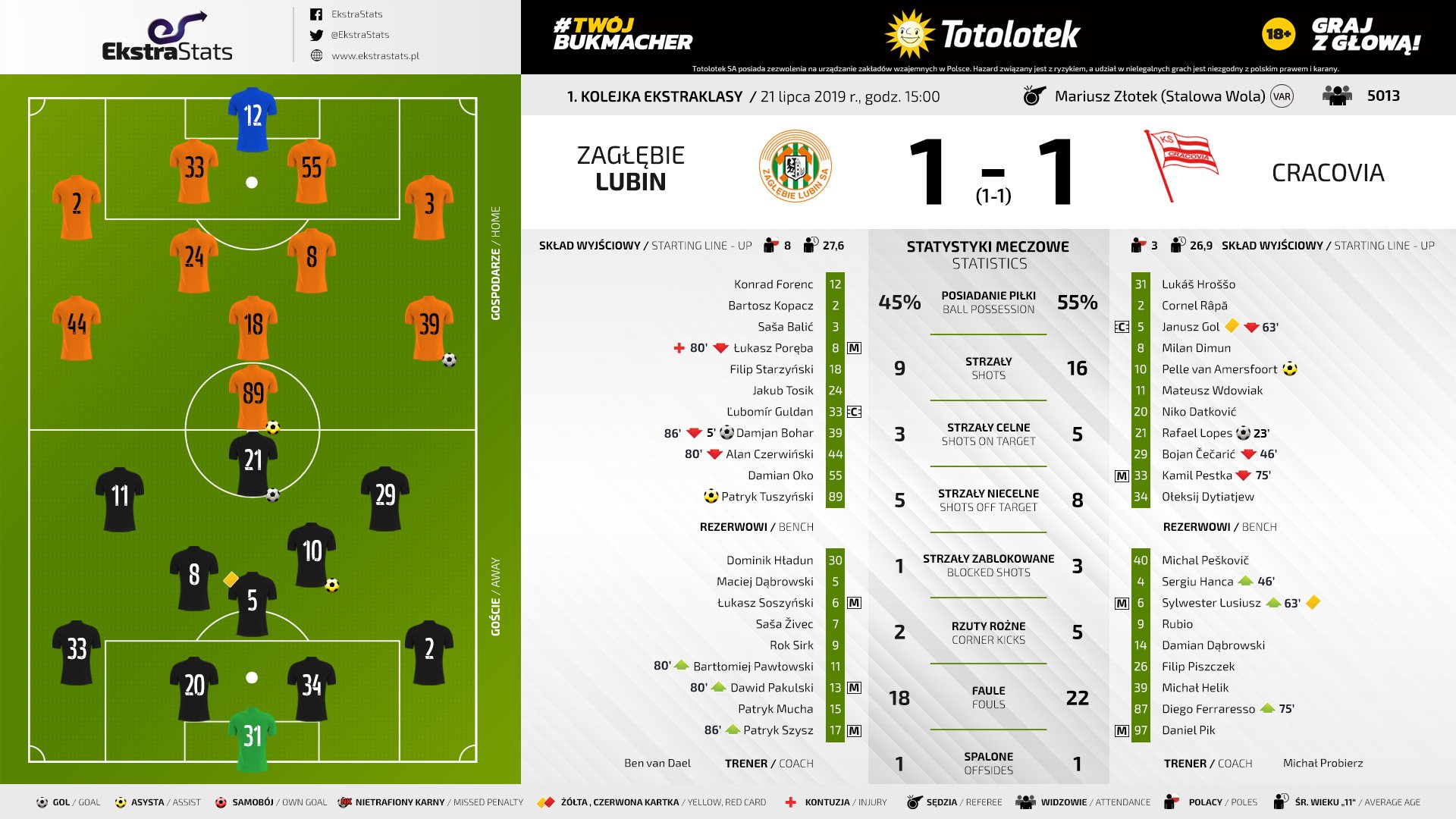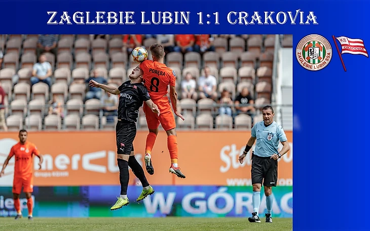 «Краковия» провела в четверг 120 минут в матче Лиги Европы со словацким «ДАК». Это должно было сказаться на состоянии краковчан и давало некоторое преимущество любинцам. Несмотря на это, забить «оранжевым» удалось уже на 5-ой минуте. Бохар воспользовался нерасторопностью защитников и мощно пробил из-за пределов штрафной в ближний угол - Хрошшо оказался бессилен. Краковчане не заметили, будто, этого пропущенного мяча и сразу же попытались сравнять счет, активна была португальско-нидерландская пара новичков «полосатых» Лопес-ван Амерсфоорт. Эта связка и привела к забитому мяча на 23-ей минуте. Нидерландец вывел португальца один на один, которому не составило большого труда переиграть Форенца, как кажется, потерявшего ворота. На достигнутом краковчане не остановились и попытались выйти вперед, определенную опасность несли в себе стандарты «полосатых», но Форенц сумел отвести все угрозы от своих ворот, а где голкипер был бессилен ему помогали защитники. На перерыв команды ушли с единицами на табло, хотя в концовке первой половины игры краковчане были близки к тому, чтобы забить второй мяч. Второй тайм вновь начался с атак хозяев, Стажиньски хитрым ударом внешней стороной стопы пытался забросить мяч за шиворот Хрошшо, но словак разгадал замысел плеймейкера любинцев. Вскоре на это нашёлся ответ у гостей, Ханка с помощью рикошета от защитника любинцев пробил в девятку ворот Форенца, но голкипер был готов к такому развитию событий и перевел мяч на угловой. Бен ван Дал пытался усилить игру своей команды заменами, на поле появился прошлогодний лидер команды Бартломей Павловски, но креатива впереди он добавить не сумел. Более того, концовку куда лучше провели гости, несмотря на усталость после игры в еврокубках. Очередная атака подопечных Пробежа закончилась тем, что Гулдану пришлось в спешном порядке выносить мяч из собственных ворот. Благо, капитан хозяев успел это сделать до того, как мяч пересек линию ворот. «Краковия» и «Заглембе» делят очки, хотя гости наиграли на победу, не обращая внимания на усталость после игры в четверг. Кажется, в этом сезоне Михал Пробеж не допустит провального старта образца прошлого сезона.