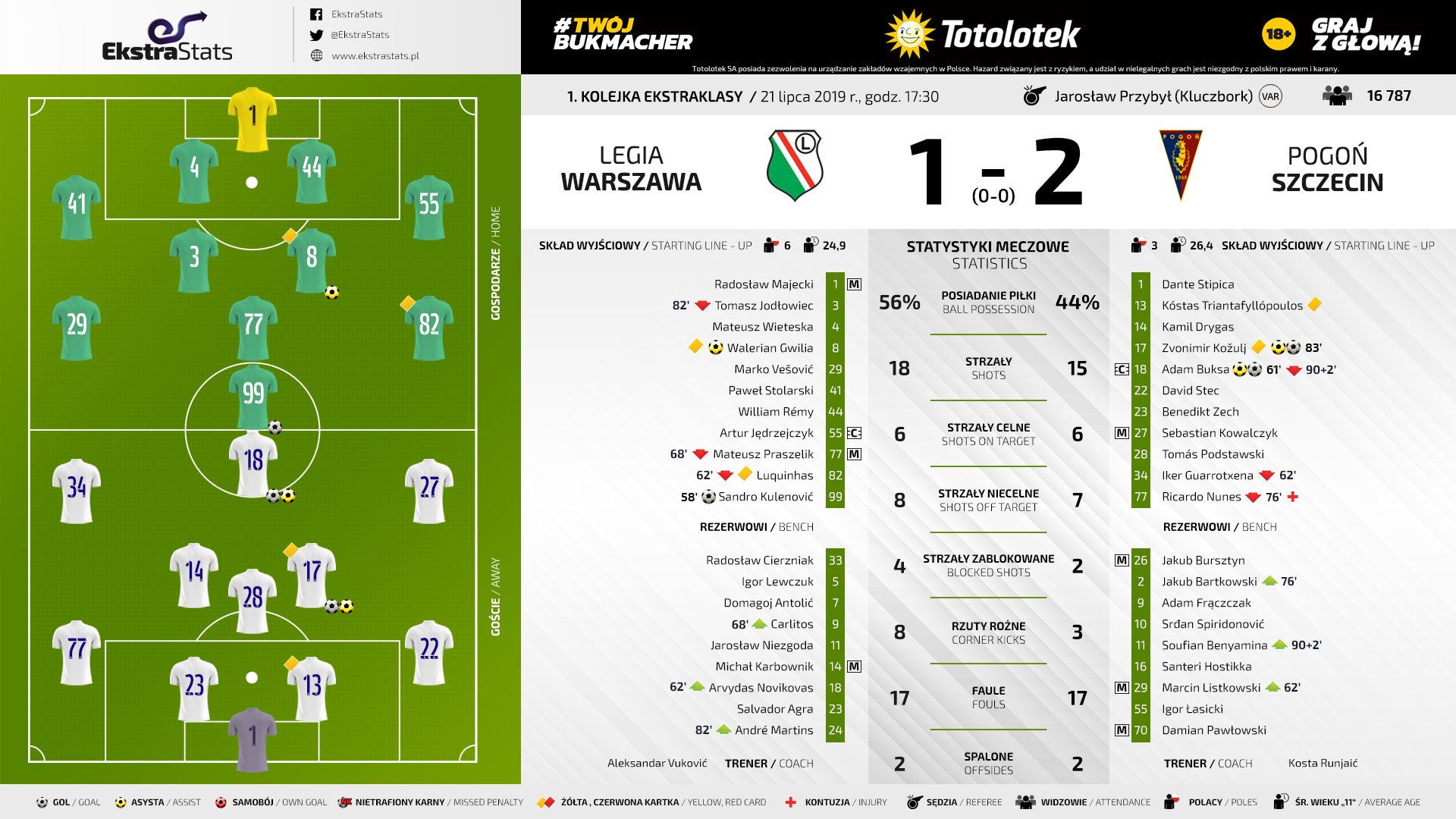 Последний раз щецинцы увозили три очка из столицы в далеком сезоне 1982/1983. В прошлом сезоне «сине-бордовые» были близки к долгожданному триумфу, но не удержали преимущество. К отчетной встрече «Погонь» подошла в полной готовности. Александар Вукович же оставил в запасе нескольких креативных футболистов атакующей линии (Надя и Карлитоса), которые были уставшими после еврокубкового матча Лиги Европы. И здесь появляется первый вопрос, зачем было использовать всех лидеров команды в матче против команды из Гибралтара, имея довольно длинную скамейку. К тому же, имелась информация, что после матча с «Европой» у некоторых лидеров «легионистов» были повреждения. Несмотря на эти проблемы, уже на 9-ой минуте Лукиньос мог открывать счет в матче, спас гостей только самоотверженный подкат Нунеса, в котором он чисто выбил мяч из ног португальского вингера варшавян. Фактически, этот момент стал последним в исполнении «армейцев» в первом тайме. «Портовцы» же сумели перехватить инициативу и несколько раз опасно пробили по воротам Майецкого. На 10-минуте Букса пробивал головой по воротам Майецкого, но молодой кипер справился с угрозой и перевел мяч на угловой. А после подачи с угла поля Триантафиллопулос пробил в стойку ворот хозяев. Атаки щецинцев не угасали, начал примеряться к воротам «Легии» Звонимир Кожуль, который в прошлом сезоне уже приносил «портовцам» победу над «армейцами» своим дальним ударом. До перерыва счет так и не был открыт, Вуковичу предстоял серьезный разговор с командой, она выглядела совершенно беззубо в первом тайме. Разговор, кажется, подействовал, хозяева стали куда чаще угрожать воротам Стипицы. Дважды в качестве наконечника выступал 18-летний Прашелик, дебютировавший в элите польского футбола, но отличиться молодому футболисту не удалось. Зато получилось это сделать у хорвата Куленовича, который удачно подставил свою голову под подачу с углового. Но прошло всего три минуты, а цифры на табло уже сравнялись, Кожуль с правого фланга прострелил на Буксу, который опередил Ветеску и протолкнул мяч в ворота. «Легия» моментально отреагировала на пропущенный мяч, на поле появились Новиковас и Карлитос. Именно через фланг литовца проходили большинство атак варшавян. Смещался под Новиковаса и Гвилия, который в первом тайме играл значительно ниже. Активность Новиковаса привела к возникновению сразу нескольких моментов у того же Гвилии и Весовича, но Стипица был на высоте и отводил все угрозы от своих ворот. «Погонь», проведшая добротный первый тайм в атаке, ждала своего шанса на контратаке. И дождалась его на 83-ей минуте. Листковски отдал передачу на Буксу, который выкатил мяч на Кожуля, также стоит отметить в этом моменте Ковальчика, пропустившего мяч на боснийского хорвата. Кожуль расстрелял Майецкого и, как и в прошлом сезоне, принёс щецинцам победу со счетом 2:1. «Легия» вновь стартует в чемпионате с поражения, а «Погонь» громко заявляет о своих амбициях, увозя из Варшавы три очка.