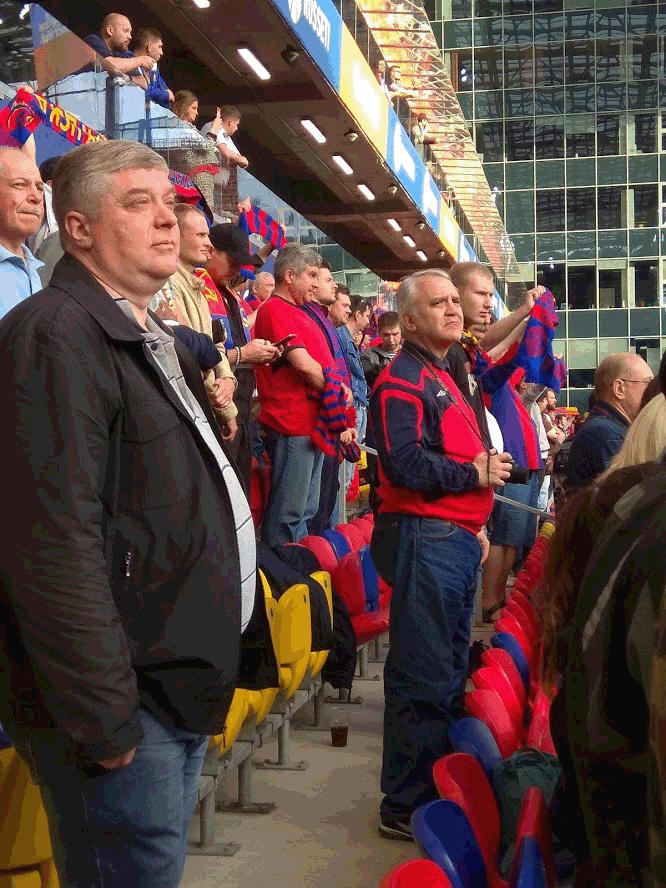 Вероятно, не все думали, как я, и на противоположной «трибуне начальничков» свободных мест было намного больше, чем занятых. Редкий случай, когда фанки, по-моему, составляли на трибунах большинство. Впрочем, возможно, такое впечатление связано именно с неумолчным ревом трибуны А – когда замолкла громоподобная стадионная трансляция, уровень шума не уменьшился.