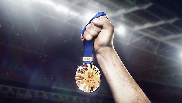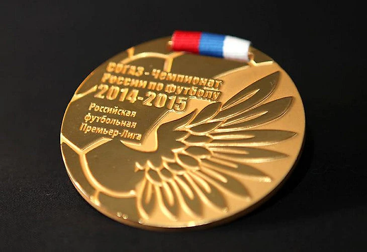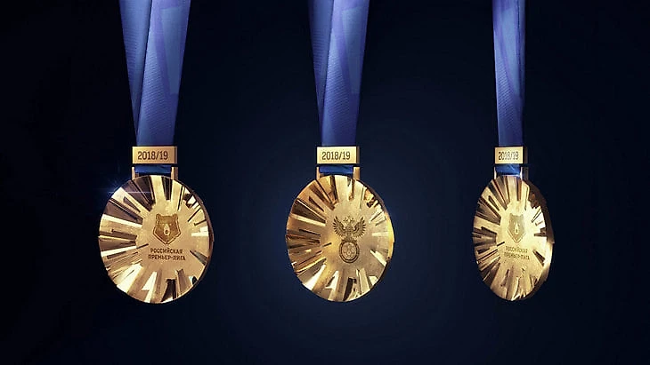 Вот так выглядят золотые медали, которые получит будущий чемпион премьер-лиги: золотой медведь, много лучей и широкая синяя лента.