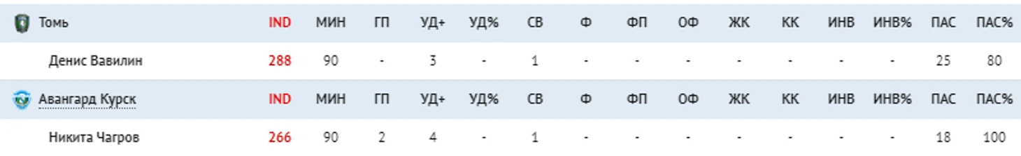 Борьбу между голкиперами выиграл игрок "Томи" Денис Вавилин, набравший 288 баллов. Его визави, Никита Чагров, набрал 266 баллов по системе Index InStat.