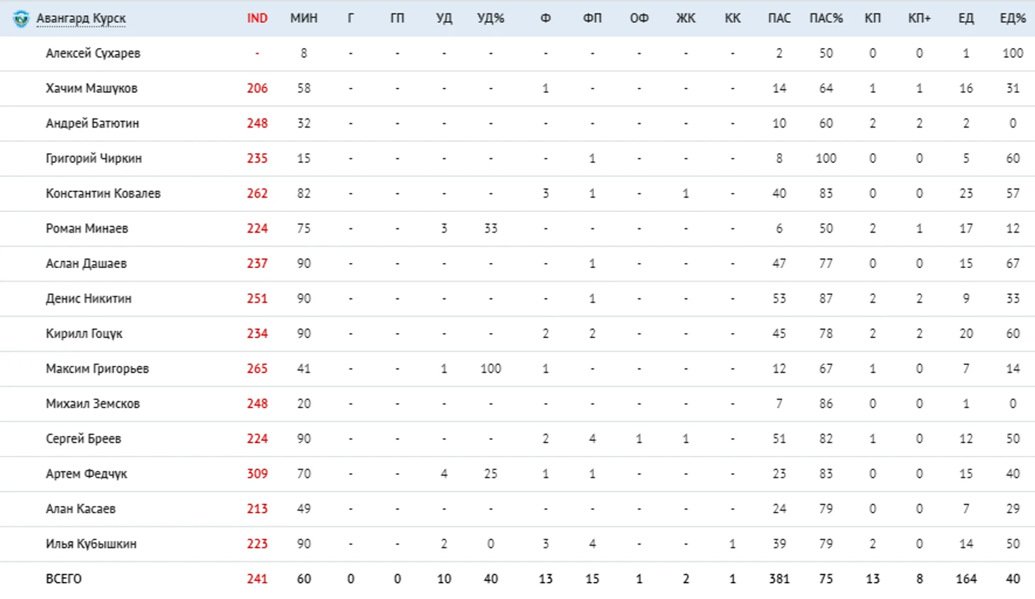 "Авангард": Чагров, Дашаев, Гоцук, Никитин, Кубышкин (удал, 75), Бреев, Машуков (Батютин, 62), Касаев (Григорьев, 53), Ковалев (Сухарев, 85), Федчук (Земсков, 74), Минаев (Чиркин, 78).