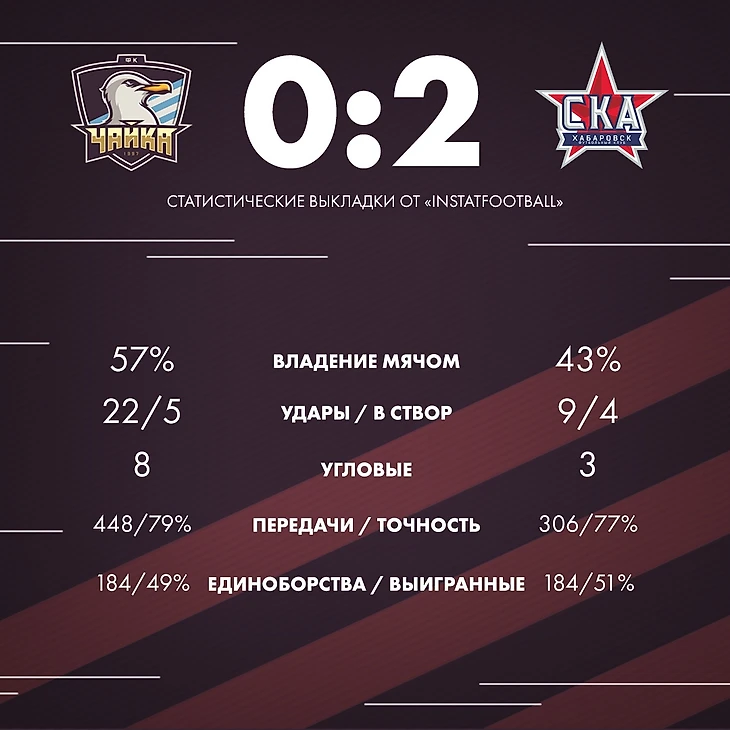 В этом матче "Чайка" выдала лучший процент владения мячом - 57% (до этого лучший результат был в матче с "Факелом" - 54%), нанесла больше всего ударов - 22 (за три предыдущих матча - 26), провела больше всего атак - 92. Все эти показатели вытекали из характера игры, СКА просто не стремился атаковать после 12-й минуты, ведя 2:0 и отдав мяч сопернику.