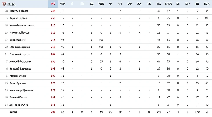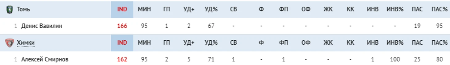 Голкиперы сегодня явно не блистали. Денис Вавилин набрал лишь 166 баллов Index InStat (в среднем за сезон у него 237), а Алексей Смирнов заработал 162 балла.