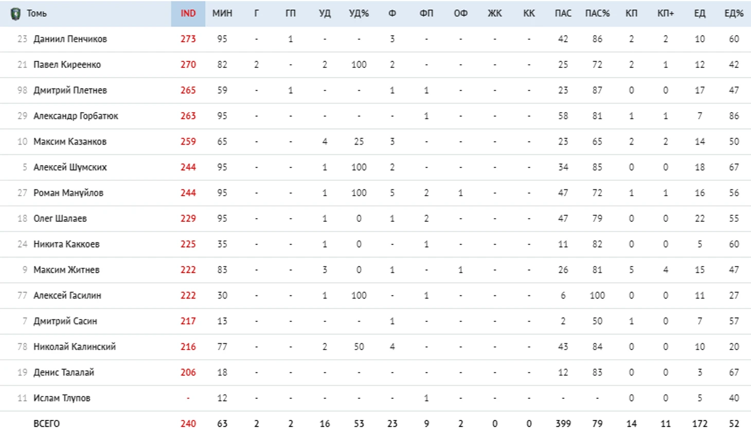 Статистика полевых игроков оказалась более стабильной. Лучшим стал Даниил Пенчиков, набравший 273 балла (1 голевая передача, 86% точных передач, 6 выигранных единоборств (из 10), 2 ключевых передач). У гостей лучшим стал Дмитрий Шилов (82% точных передач, 5 выигранных единоборств).