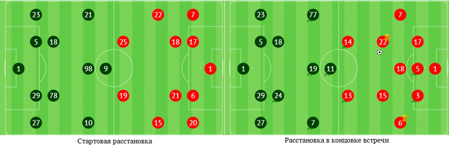 В старте вчера мы увидели несколько изменений. Василий Баскаков решил вместо Эдиева и Талалая выпустить Александра Горбатюка и Дмитрия Плетнева. В свою очередь, рулевой гостей Денис Бояринцев поменял Александра Радченко на полузащитника Евгения Андреева. В итоге мы увидели следующие составы: