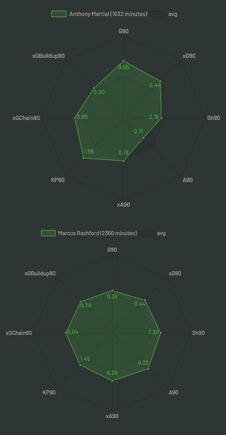 • Антони является довольно-таки крепким в этом плане, в отличии от Маркуса. Француз способен дать отпор «корпус в корпус» многим габаритным защитникам, что не скажешь про англичанина, который в борьбе против не самых габаритных игроков грубо говоря «отлетает». Марсьяль также успешен ровно в 50% верховых дуэлях, в то время, как Маркус лишь на 39.7%.