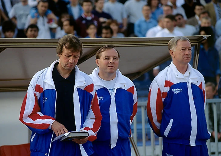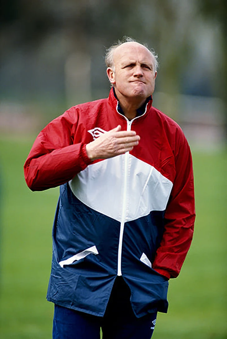 Следующая модель Umbro очень похожа на модели из современных коллекций. Но это 1990 год. На фото – Дон Хау, помощник Бобби Робсона в сборной Англии.