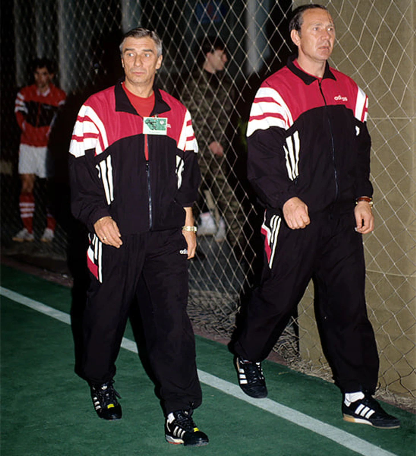Такая расцветка adidas и полосы от груди к плечам – очень популярна среди тренеров в 90-е. Георгий Ярцев и Олег Романцев на классическом зимнем турнире – Кубке Содружества.