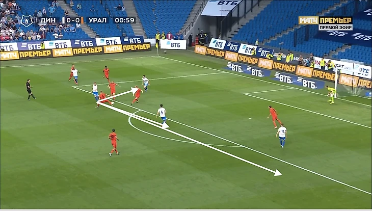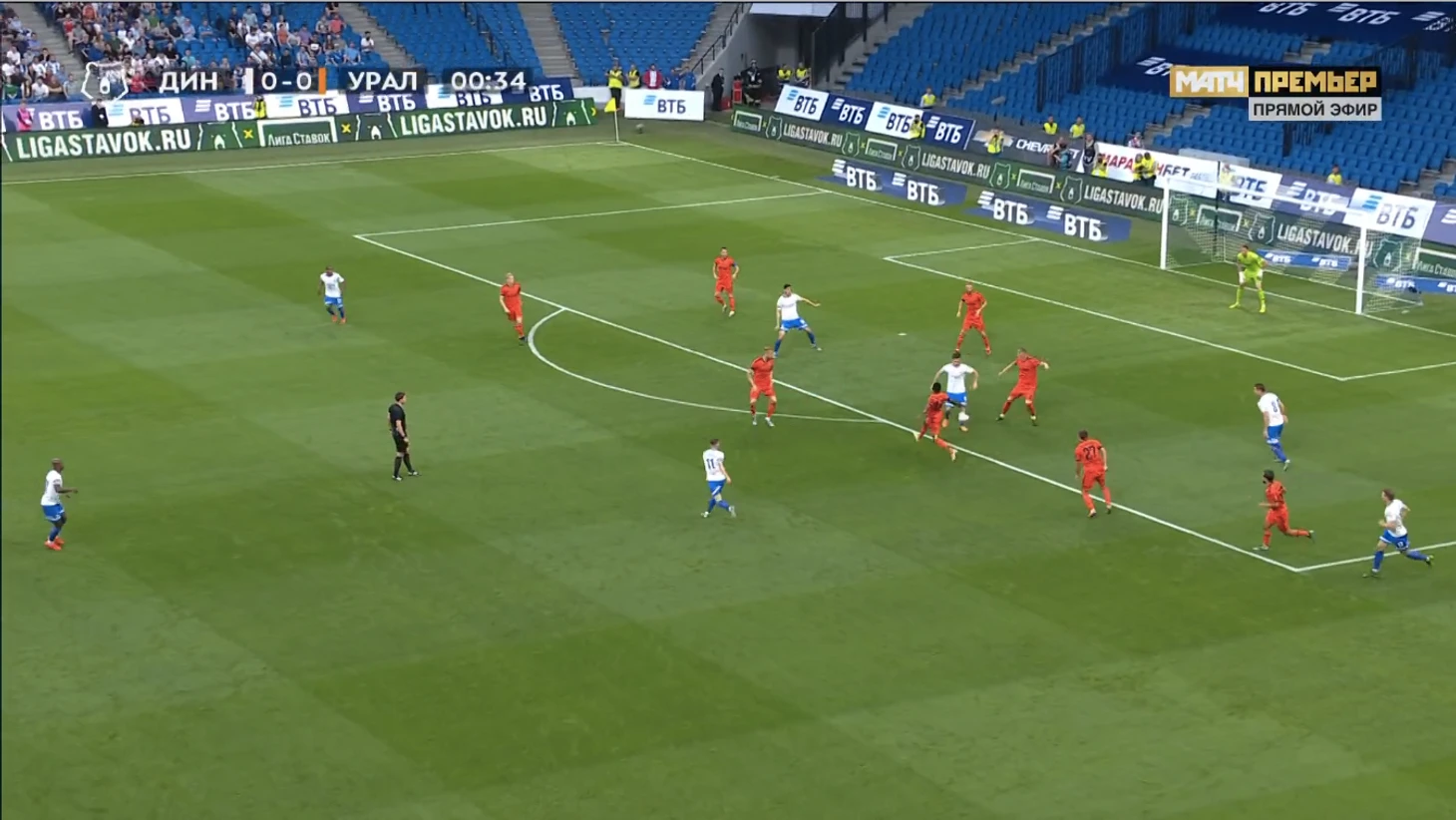 Итак, за первую минуту матча игроки «Урала» успели недоработать в эпизодах с добрый десяток раз: неточно вброшенный аут Кулакова, крайне неудобная передача назад Эрика, недобегание Меркулова, две нелепых попытки выноса и две неудачных попытки отбора от Бумаля и в целом крайне неорганизованная игра в позиционной обороне, например, кто пояснит, чем занимается оборона «Урала» в данном эпизоде?