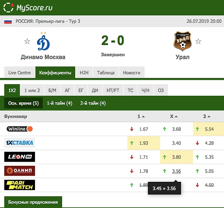 Итак, что мы имеем на начало матча: коэффициент на победу «Динамо» находился в районе 1,3-1,7, в то время, как на «Урал» - от 4 до 6: