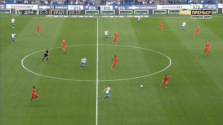 Идет 10 секунда матча, «Урал» развел мяч и реактивно полетел в атаку, заработав аут. Кулаков на пару с Бикфалви путем кривых передач назад моментально сооружают контратаку в свои ворота. На фото ниже Румынский Бергкамп выдает мощный пас назад: