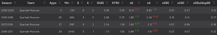Даже по прошлому сезону Фернандо был лидером "Спартака" по ключевым передачам за 90 минут (2.23), лидером по xGBuildup90 (0.27, в чемпионском сезоне, кстати, было 0.32, а самый пик был в сезоне 2017/18, где бразилец набил 0.36) и четвертым среди основных игроков по xA90 (0.14). Так что можете с удовольствием наблюдать, как разваливается весь билд-ап "Спартака" - Олег Кононов будет судорожно скидывать функцию первого паса и начала атак на пару центральных защитников.