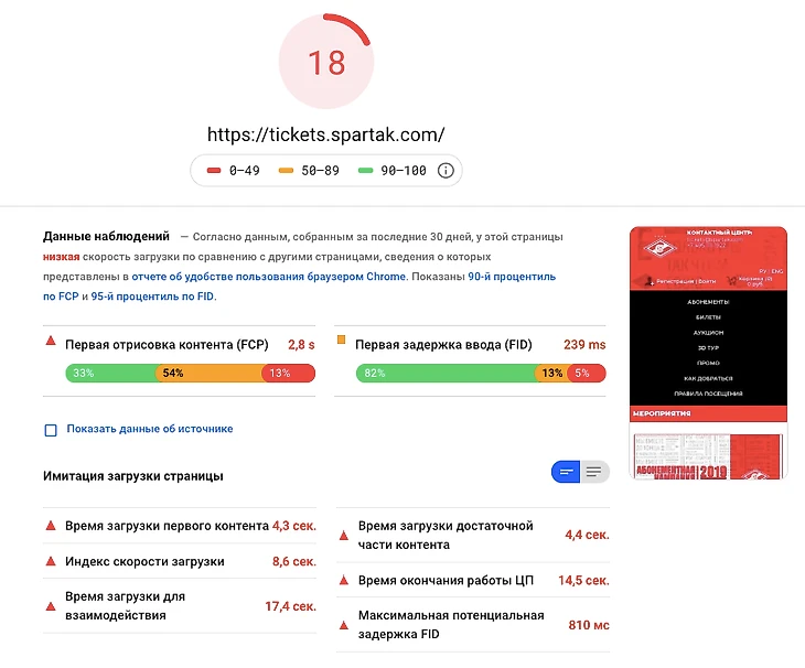 Для интереса и независимой оценки я прогнал сайт через аналитику для разработчиков от Google. Если для десктопной версии все еще не так плохо (71 балл из 100), то мобильная версия набрала всего лишь 18. При том, что доля покупок через мобильные, в среднем по рынку, уже больше 50%.