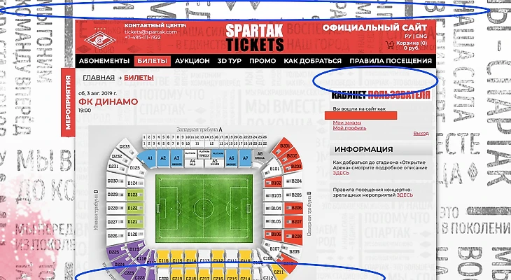 Билетный сайт «Спартака» плох и не достоин сайта главного футбольного клуба страны. Он совершенно не оптимизирован под мобильные устройства. Из открытых источников видно, что на сайте подключены Google Аналитика и Яндекс Метрика, но судя по состоянию ресурса они не настроены должным образом, и/или никто в клубе не анализирует поведение пользователей.