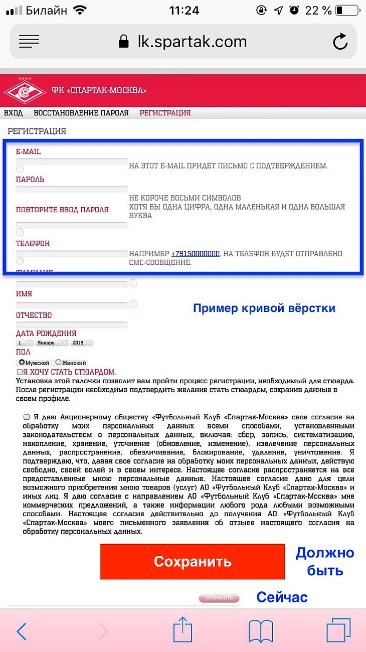 В мобильной версии страница регистрации также сверстана очень криво и плохо. Смотрите скриншот ниже. Мелкие поля для ввода данных, блеклый серый цвет. Все это не располагает к быстрому выполнению целевого действия – заполнения анкеты. Отдельно обратите внимание на кнопку «сохранить». На нее элементарно сложно нажать из-за маленького размера и блеклого цвета. На скриншоте я нарисовал, как должна выглядеть кнопка.