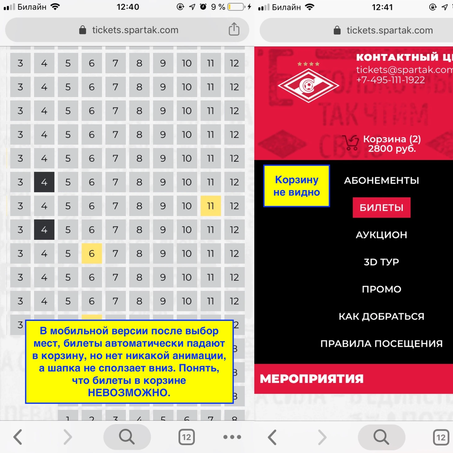 Она в корзине! Корзина так плохо подсвечена, что ее особо не видно на фоне шапки! Я честно потратил минут 5 времени, чтобы понять как все работает. В мобильной версии я и вовсе не понял все с первого раза. Мне пришлось открыть сайт на компьютере и пройти весть процесс заново, т.к. на телефоне блок с выбором места перекрывает шапку и понять, что билеты в корзине найти просто невозможно. А сколько людей плюнули и вышли? Вот он, обрыв воронки. Люди в 2019-м не будут пытаться разобраться, они уйдут к конкуренту.