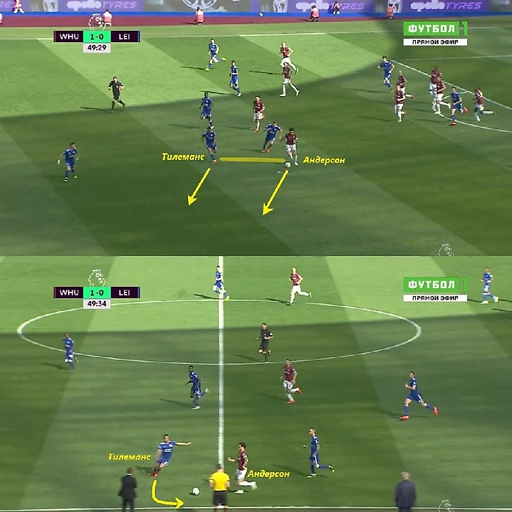 В среднем и низком блоке Тилеманс играет в паре с Ндиди. У Мэддисона обычно есть персональные ориентировки по разыгрывающему опорнику соперника, поэтому он располагается выше. Ндиди стал вторым по количеству отборов в АПЛ в среднем за игру (3.8) и вошел в десятку лидеров по перехватам (2.2 за игру). Более сдержанный бельгиец отлично дополнял агрессивного Ндиди и нередко страховал его зону. Тилеманс предпочитает пласироваться перед соперником полубоком и, тем самым, закрывает ему проход в центр. Из-за этого Тилеманса не всегда можно обыграть. Такой стиль оборонительной игры помогает бельгийцу в предотвращении резких контратак соперника. Как пример - попытка убежать Фелипе Андерсона. Тилеманс грамотно перекрыл ему путь в центр и на фланге завершил эпизод своевременным подкатом.