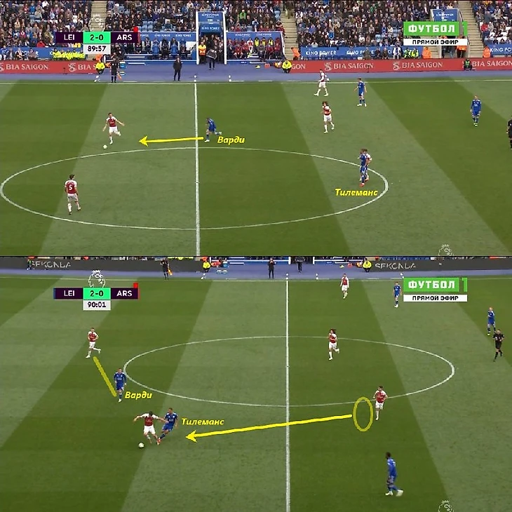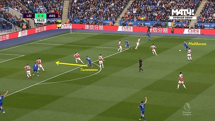 4) Кроссы под рывки Джейми Варди. Не очень часто, но Тилеманс все-таки загружает в штрафную навесы. Получается неплохо. Его резкие, летящие по низкой траектории, подачи сложно перехватить. А вот открываться под кроссы и прострелы Тилеманс не особо любит. Да и с таким ростом (176 см) в штрафной делать особо нечего. Тилеманс чаще остается для подбора в зоне 14. Совсем другое дело - забегания за спины защитникам. На примере ниже Тилеманс увидел открытую зону и ворвался туда под передачу — так «Лестер» забил первый гол в ворота «Арсенала».