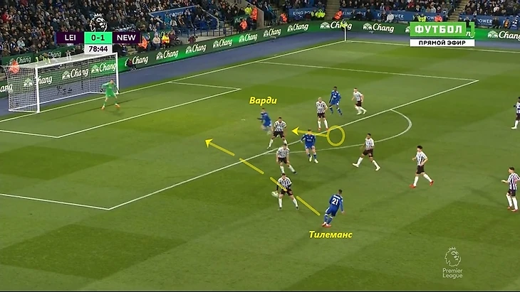 2) Проникающие передачи в штрафную под забегания форварда или вингеров. Тут Тилемансу помогает важный скилл - умение замечать рывки партнеров и вовремя на них реагировать + выдерживать момент передачи по таймингу. На скриншоте показана позиция с которой стартовал Варди — Юри сразу же увидел рывок нападающего. В результате бельгиец шикарным пасом вывел Варди на ударную позицию.