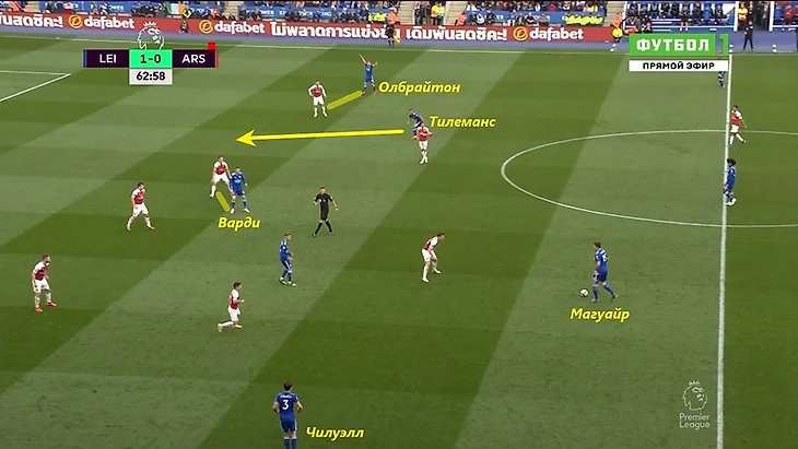 Еще одно доказательство высокого уровня футбольного интеллекта Тилеманса - заполнение коридоров между КЗ и ЦЗ. Правда, далеко не всегда партнеры понимают планы бельгийца. Часто возникали ситуации, когда Тилеманс открывался и даже жестикулировал партнерам, но пас так и не получал. Впрочем, такие моменты команда должна отработать на предсезонке и войти в новый сезон уже более сыгранной. В эпизоде на скрине Варди взял на себя ЦЗ, а Олбрайтон связал фулбека. Тилеманс был бы открыт, но Магуайр поторопился и отдал передачу на Чилуэлла.