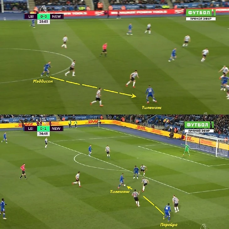 Любимая зона для Тилеманса - правый полуфланг. Перед приемом он крутит головой и по возможности располагается вполоборота к воротам соперника. Такое положение корпуса дает ему преимущество перед защитниками. Еще одна важная мелочь - обработка и контроль мяча дальней от соперников ногой. Ниже показано, как Тилеманс принимает правой ногой пас, идущий с левой стороны от Мэддисона, и уже левой ногой принимает передачу с правого фланга от Перейры.