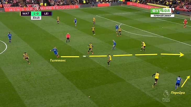 В первом матче под руководством Роджерса «Лестер» играл против «Уотфорда» по схеме 3-4-2-1. Пару центральных хавбеков составили Тилеманс и Ндиди, а Джеймс Мэддисон вышел на позиции левого вингера. Такой выбор схемы объяснялся желанием Роджерса создать преимущество в первой линии билд-апа, ведь «Уотфорд» обычно играет 4-4-2 (4-2-2-2) с двумя форвардами в первой линии прессинга. Но все пошло не совсем по плану — забив быстрый мяч, «Уотфорд» практически перестал прессинговать тройку ЦЗ, а вместо этого пара форвардов плотно опекала Ндиди и Тилеманса. В сложившейся ситуации бельгиец чувствовал себя максимально неуютно. Сбрасывать опеку - не самое сильное его качество.