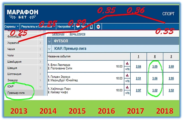 Добрый день!Сегодня заканчивается первый тур в ЮАР - этот турнир есть в арсенале многих ничейщиков. Конечно, букмекер не даст играть слишком валуйные коэффициенты, но последние 3 года, ситуация с ничьими настолько стабильна, что можно легко набивать плюс. Практически "по умолчанию" всё, что выше 3,00 - всё валуйно, добавьте пару правил отбора игр и прибыль по матчам ЮАР уже Ваша.На диаграмме - красным указан процент ничьих в ЮАР по годам за последние 6 лет и в качестве фона три ставки на сегодня. Команды более-менее середняки, каких-либо топ форвардов летом не купили. Составы за лето, конечно чуть обновились, но трансферы, в основном, в защитную линию. Тренеры сменились только в первой паре. Не ставьте много, первый тур всё-таки. Удачи!