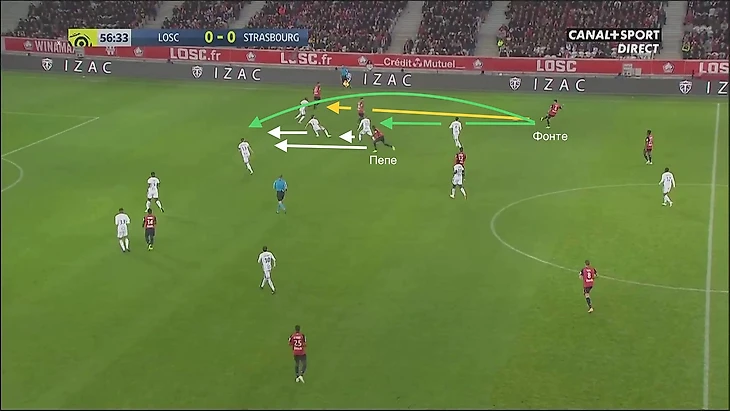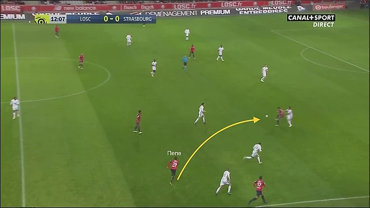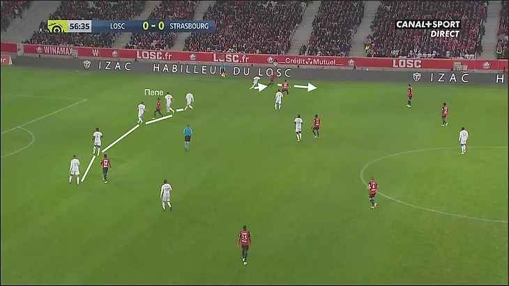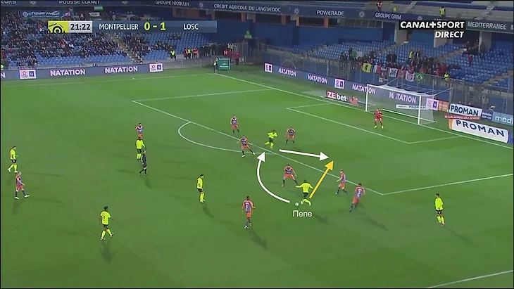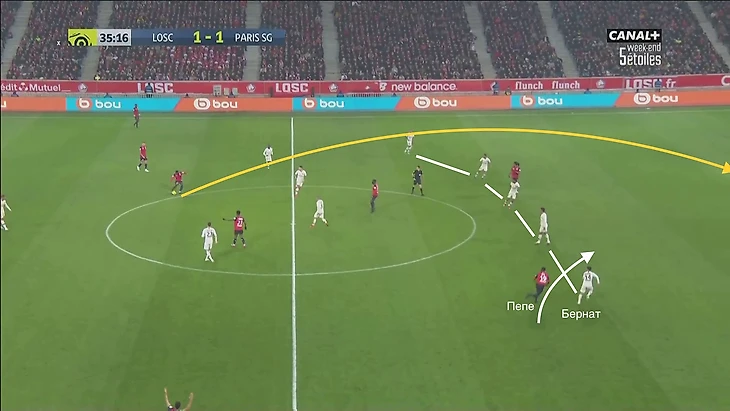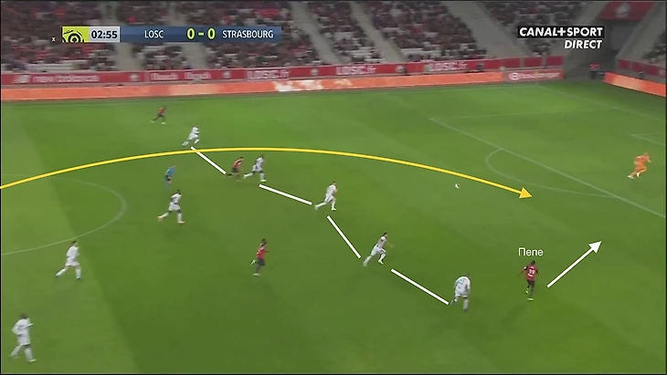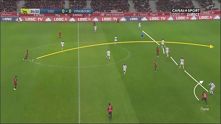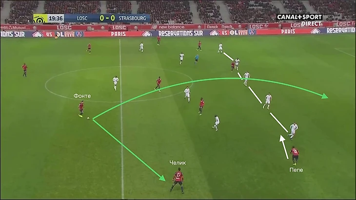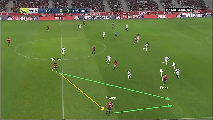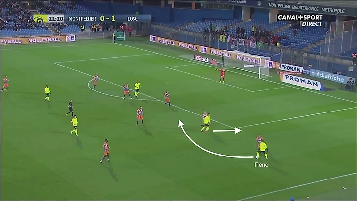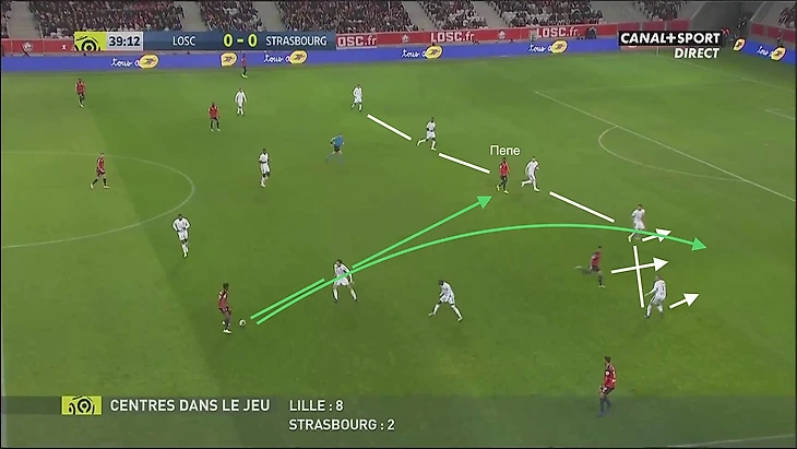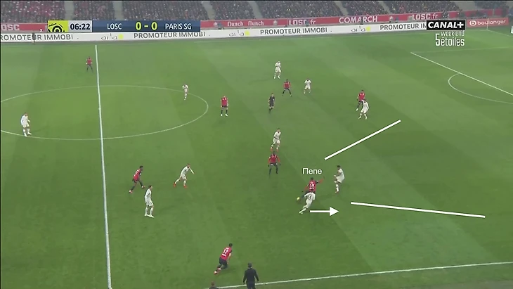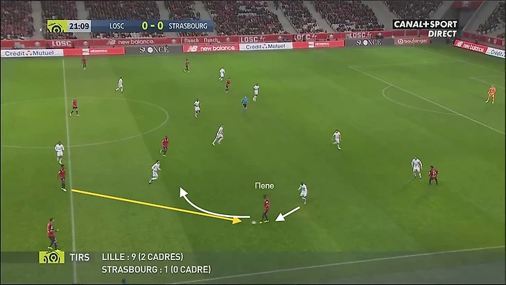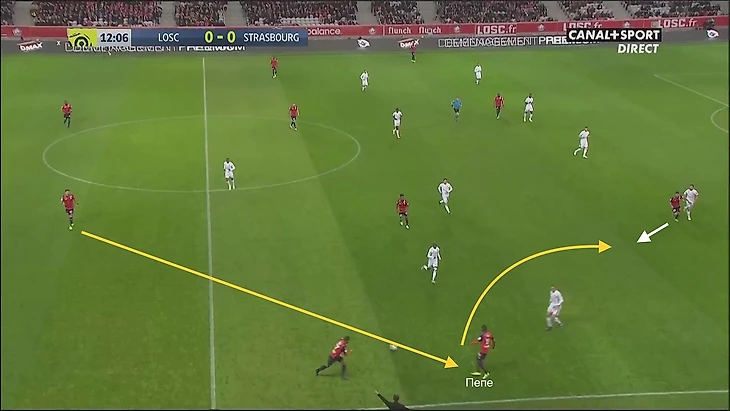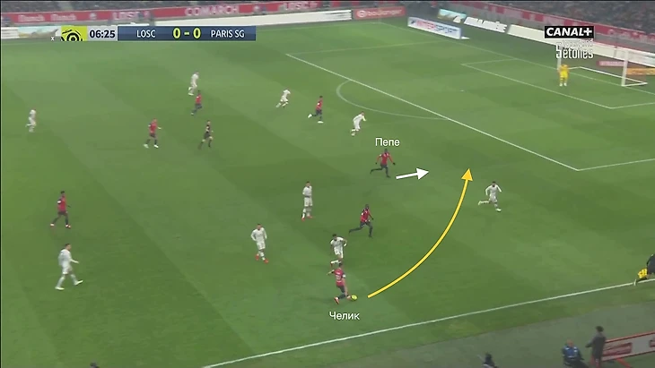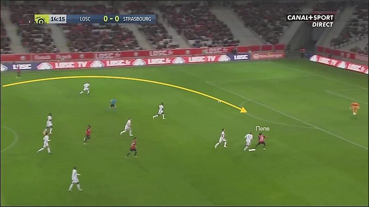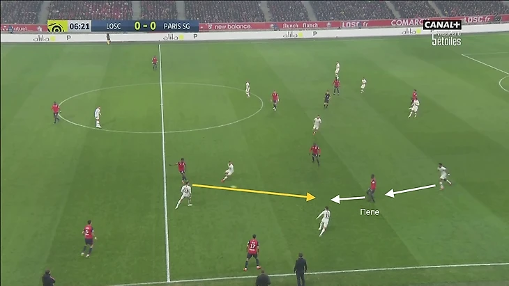 Пепе ускоряется и уводит за собой сразу двух защитников. Крайний полузащитник успел сместиться на фланг, иначе у "Лилля" было бы численное преимущество.