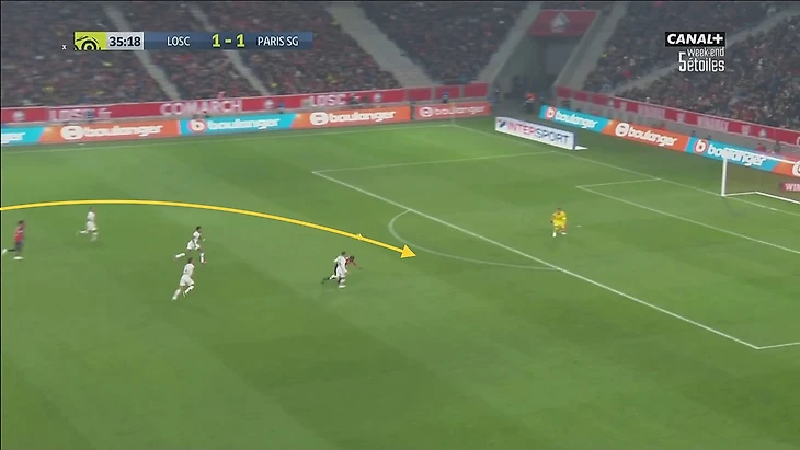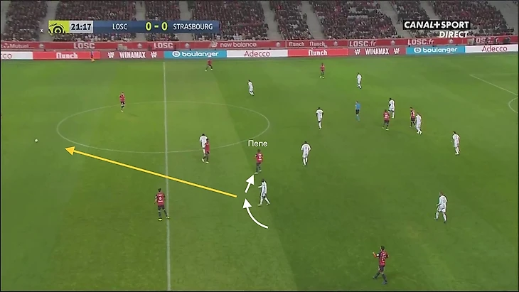 Кот-д'Ивуарец был центром активности и изобретательности этого "Лилля". Он инвертированный вингер, и одно из очевидных движений для него, смещение с фланга в центр с последующим обострением.