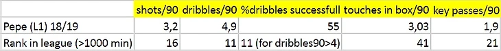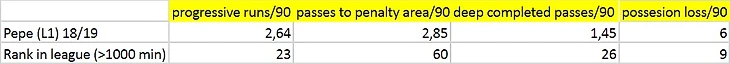В чем он выделяется, так это в xG статистике. Пепе 7-й в Лиге 1 по xG/90, и 11-й по xA/90 (6 не из "ПСЖ") среди сыгравших больше 1000 минут. Первое - во многом результат контратак и пенальти, а второе - того, что Николя действительно хорошо ассистирует и играет в подыгрыше. Еще больше крутости Пепе остается без внимания статистики.