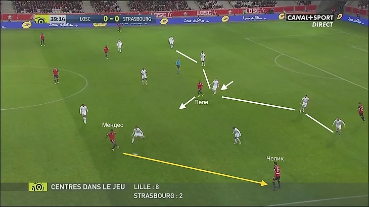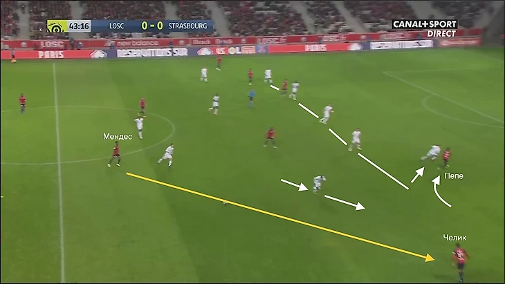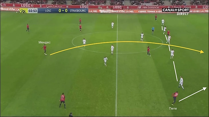 Партнер забегает в канал между защитниками, Пепе с позиции центрального нападающего делает ложное движение, еще больше ломая линию обороны. Но Мендес все же выбирает надежный вариант с передачей на фланг.