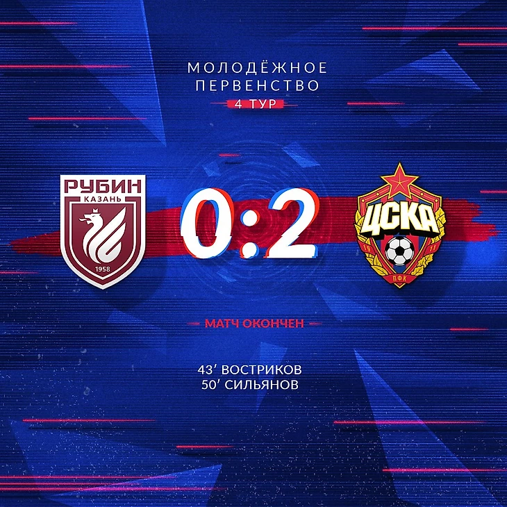 Встреча в Казани завершилась победой «молодежки» армейцев со счетом 2:0. В конце первого тайма Илья Востриков открыл счет, а в начале второй половины отличился Александр Сильянов. ЦСКА с 8 очками поднялся на третье место в турнирной таблице, у «Рубина» 2 очка и 14-я позиция.