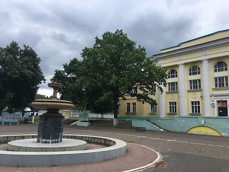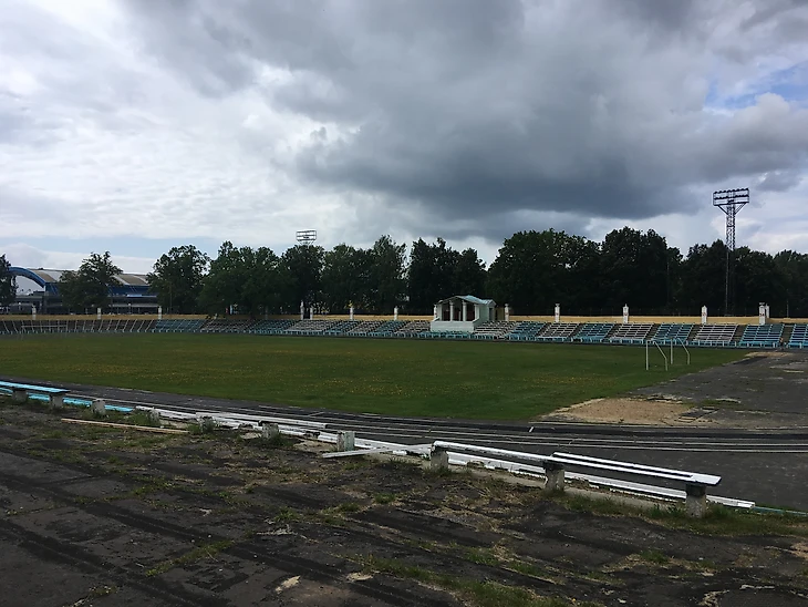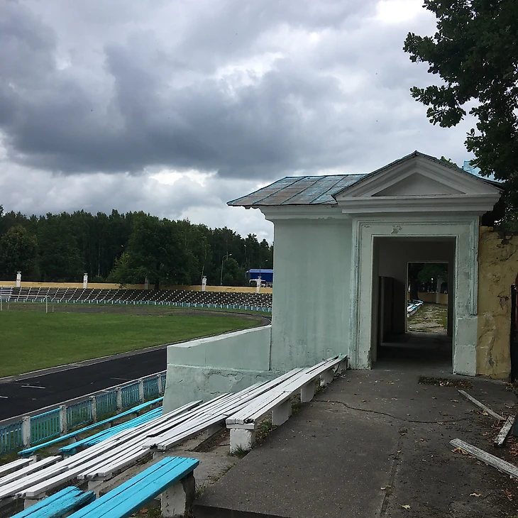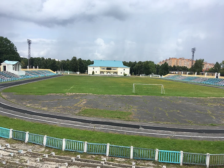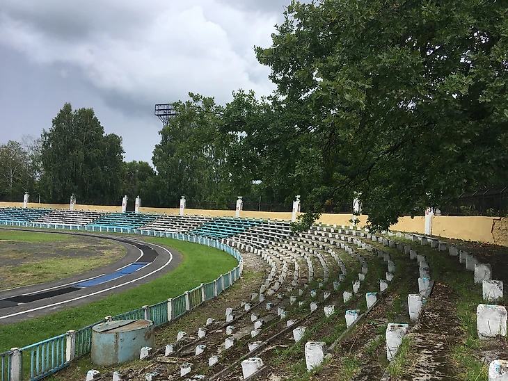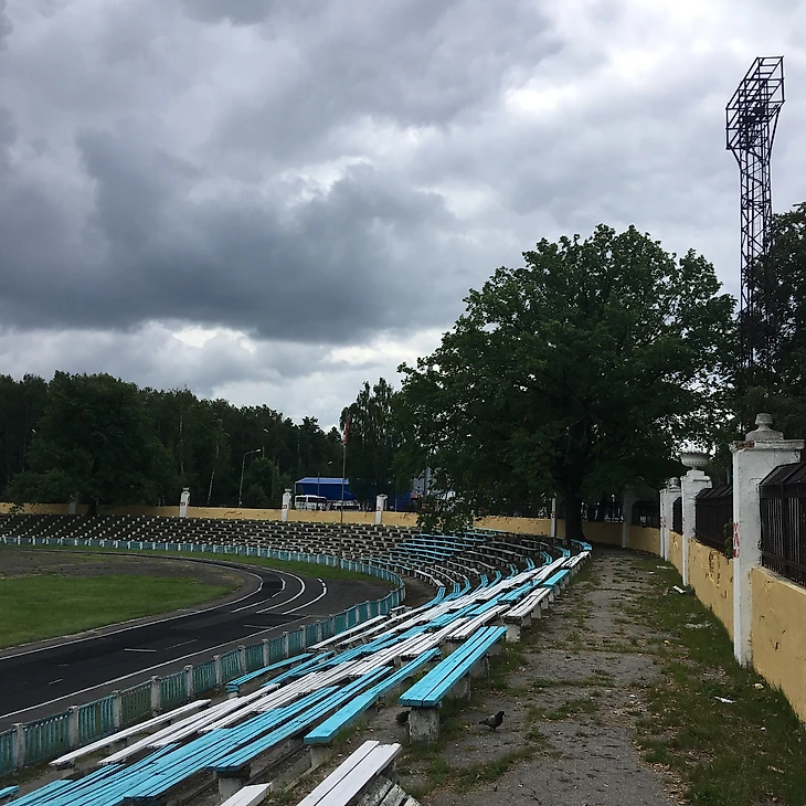 Вернемся на арену. Классический стадион постройки сороковых - пятидесятых годов прошлого века. Два входа к трибунам украшают скульптуры советских атлетов. Сам стадион сделан в виде двух центральных трибун и "виража" за дальними от входа воротами. Посередине правой стороны стадиона расположена трибуна, с которой руководство завода приветствовала, проходившие на этом стадионе, первомайские демонстрации. Так как, местная команда не снискала особых успехов ни в советское, ни в российское, стадион постепенно пришел в негодность.