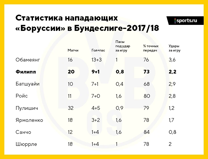 До травмы колена в декабре 2017-го, из-за которой Филипп пропустил 11 матчей, по забитым голам он шел вровень с Обамеянгом. В итоге немец стал вторым бомбардиром клуба. Условия для прогресса были идеальные. Стиль тогдашнего тренера Петера Боса, предполагающий стремительные вертикальные переходы из обороны в атаку, подходил Максу, он был освобожден от конкуренции с Марко Ройсом, который лечился весь первый круг. Филипп продирался сквозь защитников, подтягивая мяч к штрафной, и сам создавал себе голевые моменты.