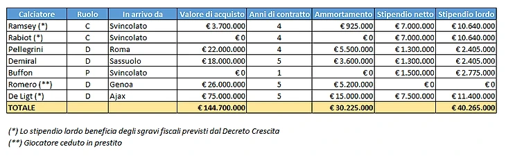 Примечание к столбцам: Calciatore - Игрок, Ruolo - Позиция, In arrivo da - Откуда пришел, Valore di acuisto - Сумма трансфера, Anni di contratto - Срок контракта, Ammortamento - Амортизация, Stipendio netto - Чистая зарплата, Stipendio lordo - Валовая зарплата.