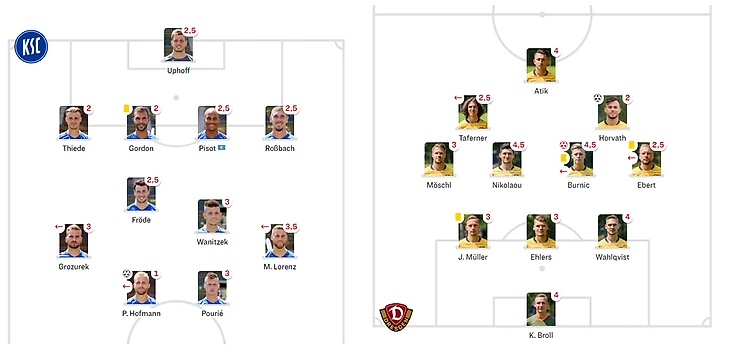 Оценки защитников «Карлсруэ» заметно преувеличены. Хофманн с сильной натяжкой сыграл на 1,0. Оценки полузащиты тоже где-то на 0,5 балов завышены. Разница между Мюллером – Элерсом и Вальквистом не столь существенная, как и между Мешлем и Эбертом.