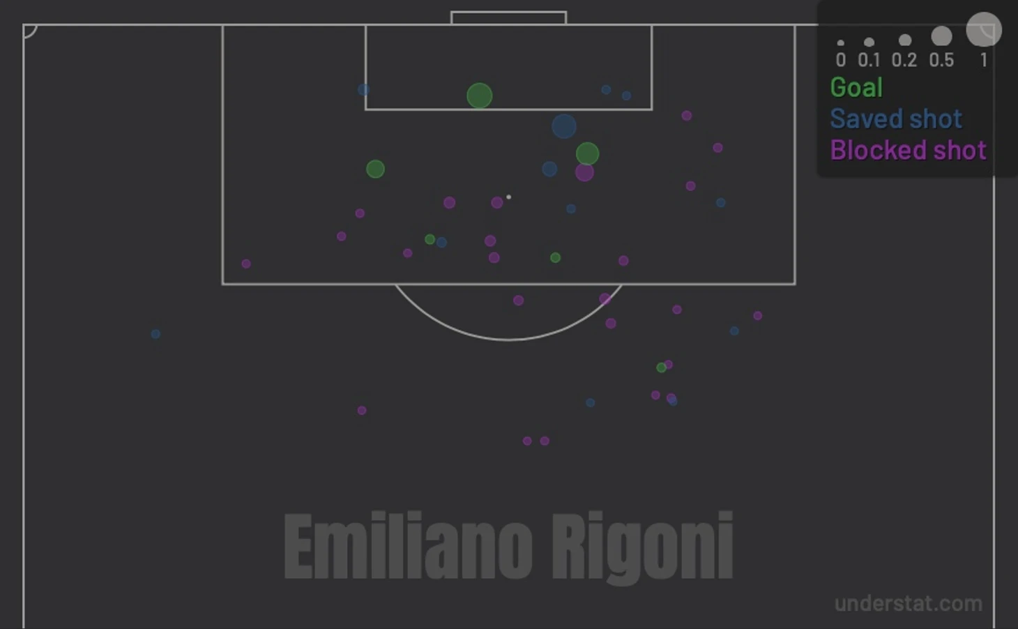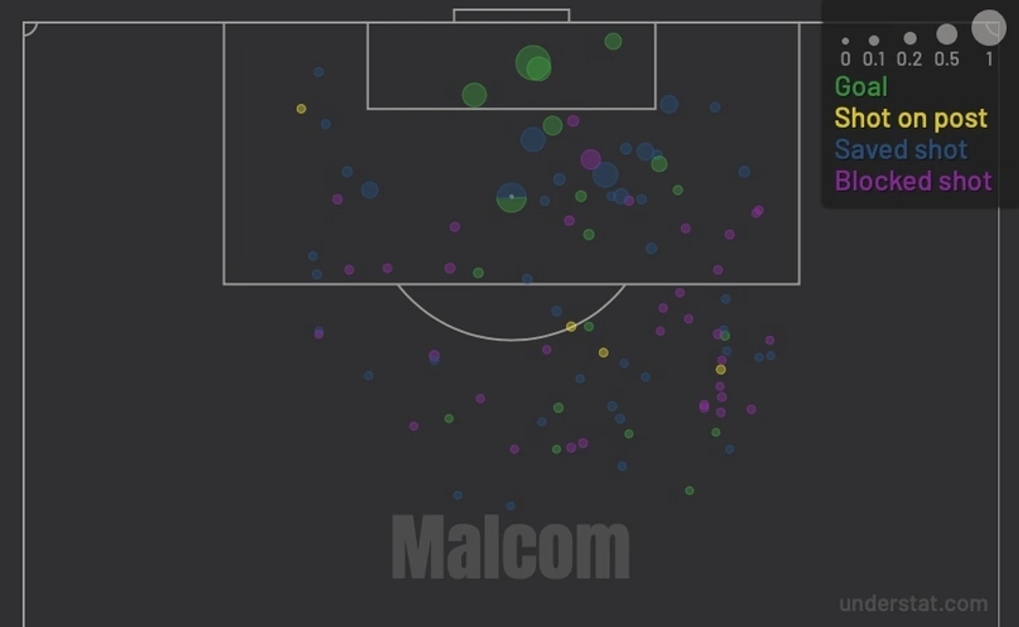 Рассматривая статистику ударов за последние 3 сезона, можно сделать вывод, что у футболиста хороший поставленный, мощный удар с левой ноги. При этом Малком не боится пробивать с дальних дистанций, потвреждением этому служит статистика приведенная с сайта understat.com за последние 3 сезона (скриншот 1). Для сравнения, на скриншоте 2, приведена статистика ударов Эмилиано Ригони за последние 3 сезона.