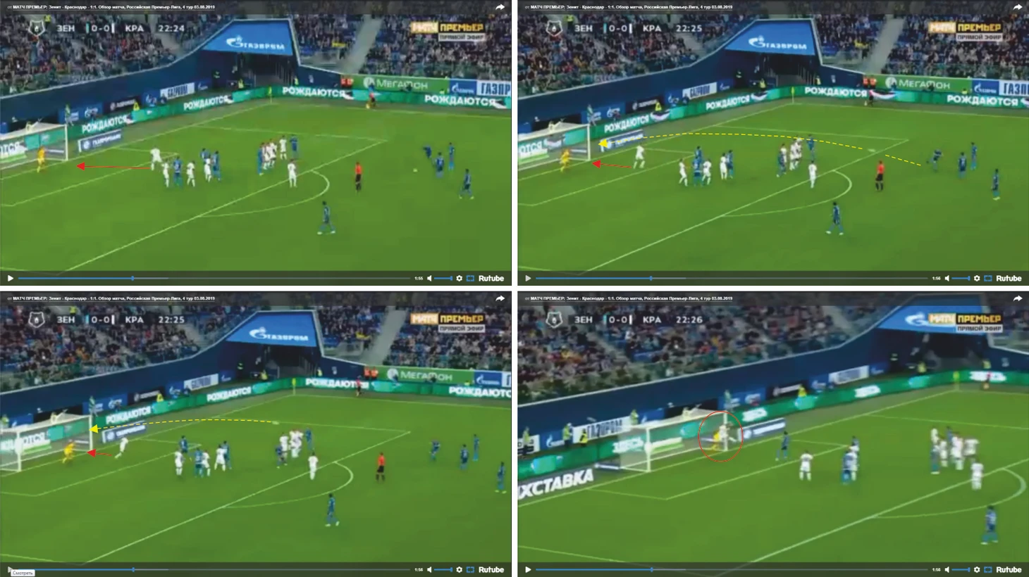 А во-вторых, в обоих случаях попытки Спайича помочь Сафонову были совсем не нужны. Посмотрите внимательно эпизод в игре с «Зенитом». Серб начинает разбег в сторону собственных ворот одновременно с разбегом бьющего штрафной игрока. Удар производится с 22-23 метров. При этом защитник практически с самого начала находится в траектории полета мяча. Что позволяет ему уже к середине полета мяча развернуться к нему лицом находясь вратарской площади. И дальше он, видя и контролируя ситуацию принимает мяч на себя. Но при этом в момент, когда Спайич это делает, он практически сталкивается с Матвеем Сафоновым, который также полностью контролировал этот удар. Просто его защитник оказывается перед ним. А ведь могло случится и немного по-другому. Пятясь назад, спиной к собственным воротам Спайич вполне мог сильнее наткнуться на вратаря, что привело бы к падению обоих. И тогда неизвестно, чем бы закончился этот эпизод.