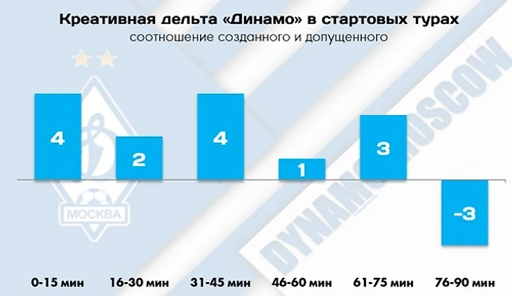 Стоит отметить, что во всех проведенных матчах вторые таймы динамовцам удавались гораздо хуже, чем первые – и это несмотря на то, что против «Рубина» и «Спартака» примерно с 35-й минуты они играли в численном большинстве.
